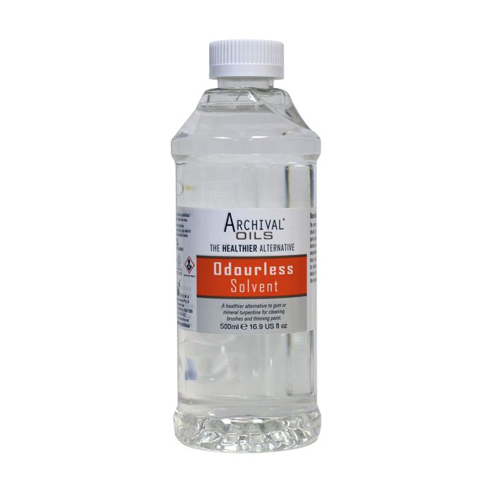 Archival Odourless Solvent is a general purpose, low toxicity solvent which may be used as a replacement for gum and mineral turpentine to thin paint and clean brushes.
